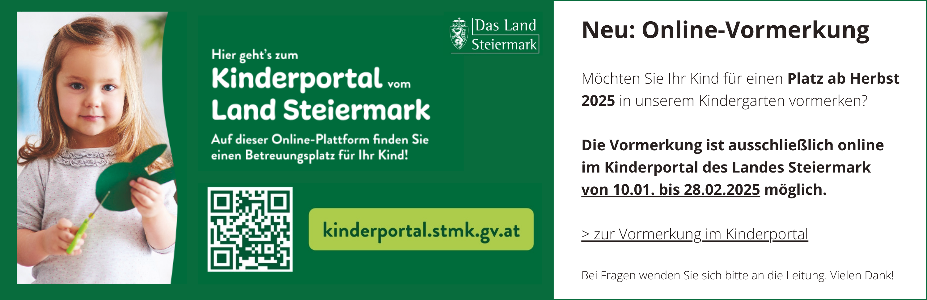 Die Vormerkung für das Kinderbildungs- und -betreuungsjahr 2025/ 2026 im Zeitraum von 10.01. bis 28.02.2025 über das Kinderportal des Land Steiermarks möglich.