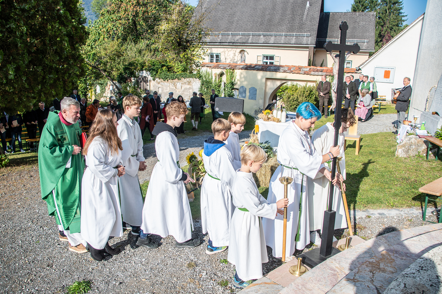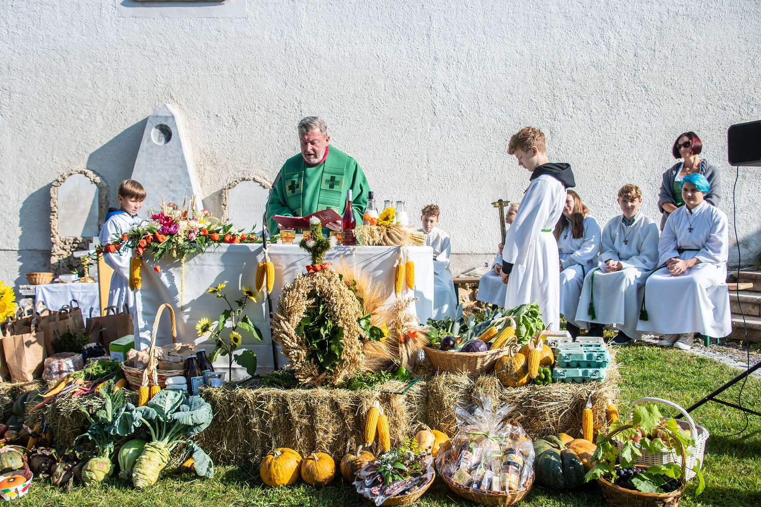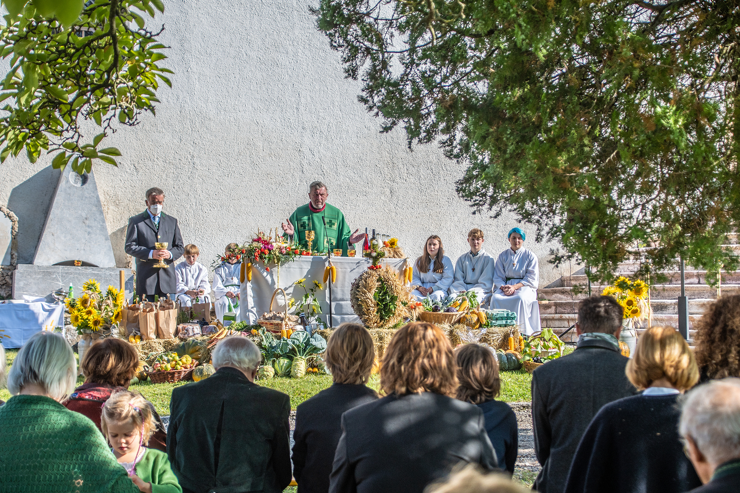 Am Sonntag, dem 3.10.2021, feierte bei strahlendem Herbstwetter die Pfarrbevölkerung von Deutschfeistritz mit Pfarrer Dr. Horst Hüttel das Erntedankfest. Ein von unseren Bauern, vom Obstbauverein und vom Imkereiverein festlich geschmückter Altartisch bildete den Mittelpunkt dieser Feier. Die Marktmusikkapelle trug zur festlichen Gestaltung der Hl. Messe wesentlich bei.
