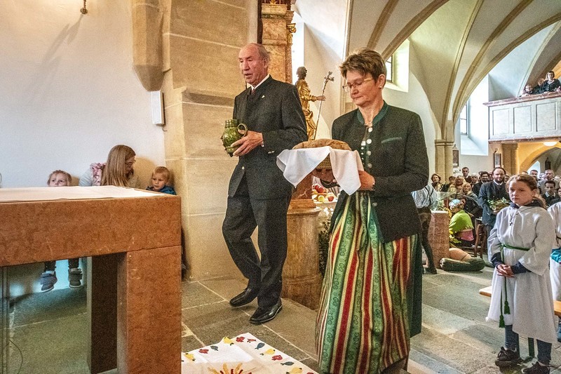 Die Kinder des Pfarrkindergartens zogen feierlich mit einer kleinen Erntekrone in die Kirche ein. Schon Wochen vorher übten sie verschiedene Lieder ein, die sie mit Begeisterung aus voller Kehle sangen. Vertreter der Bauernschaft legten Erntegaben vor dem Altar nieder und für die Bauern berichtete Frau Köppel von den Witterungsbedingungen des abgelaufenen landwirtschaftlichen Jahres, die eine gute Ernte ermöglichten. Sie wies aber auch auf die vielfachen anderen Bereiche unseres Lebens hin, für die wir dankbar sein müssen.