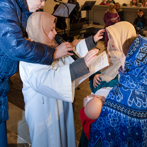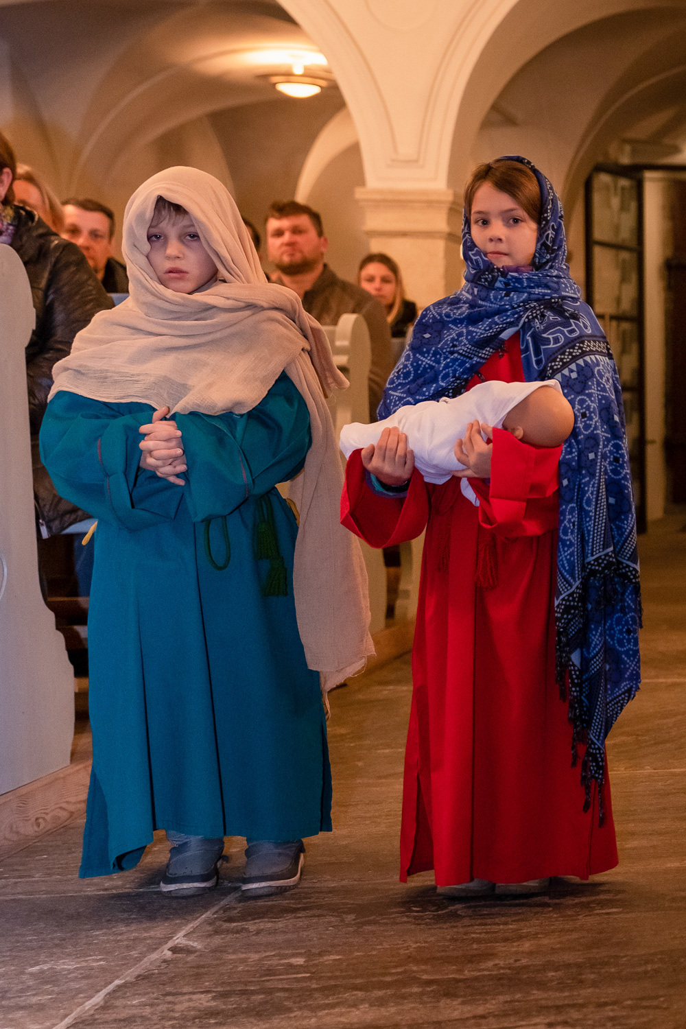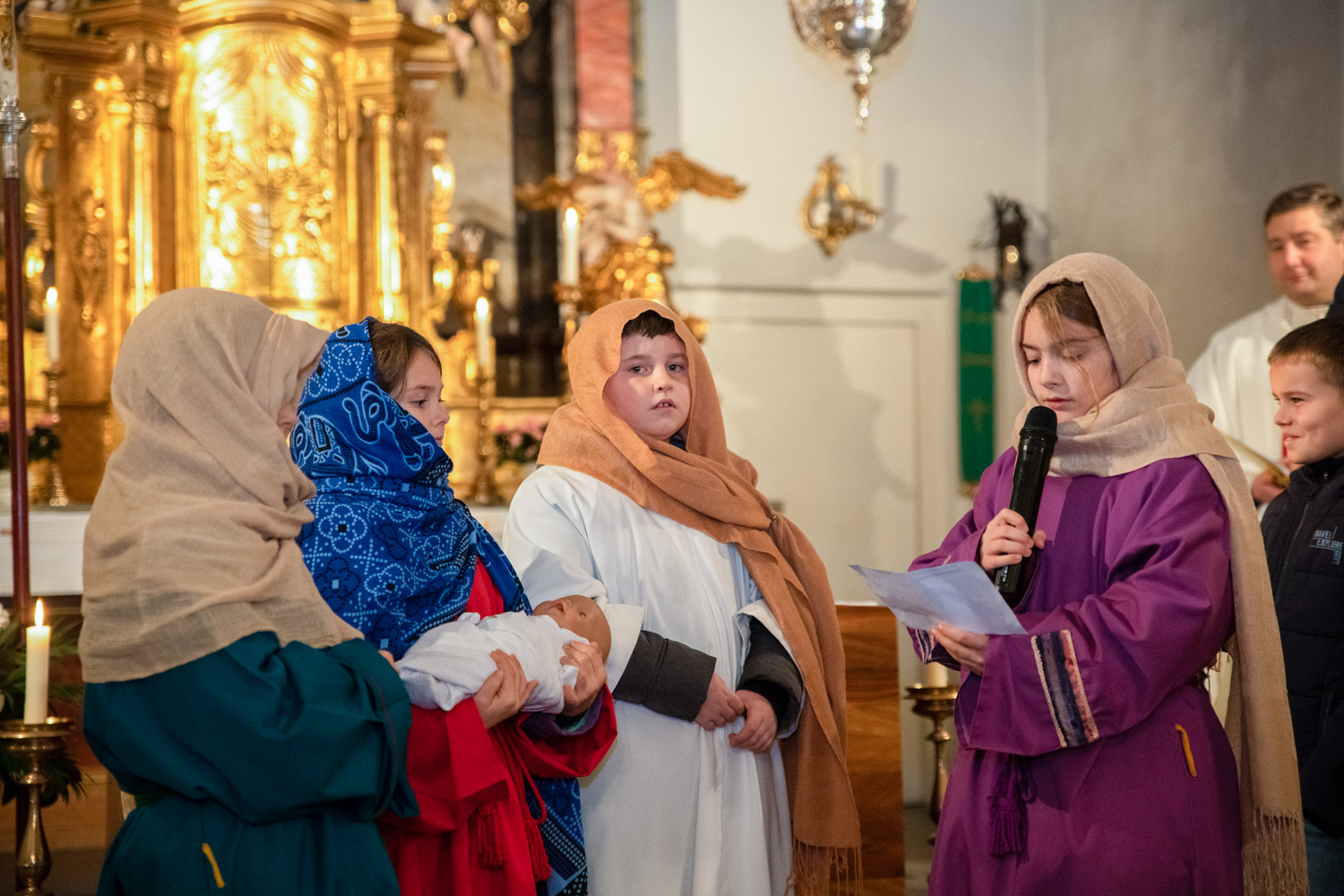 Die Kinder spielten die bekannte Bibelstelle aus Lukas 2,22–40, wo Maria und Josef mit dem kleinen Jesus in den Tempel kommen, das Kind Gott weihen.