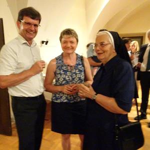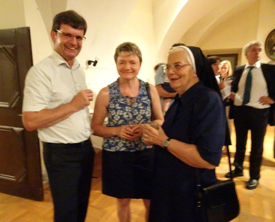 Die feierliche Begrüßung erfolgte durch Vorsitzenden des PGRs, Franz Rappold, einleitenden Worte sprach dann die Organisatorin der sehr gelungenen Collagen, Angelika Hütter, und Pater Simon dankte allen, die zur heutigen Vernissage gekommen sind, darunter u.a. den Em.-Diözesanbischof Dr. Egon Kapellari, den Armen-Pfarrer Wolfgang Pucher, die gesamte heimische Politprominenz sowie die anwesenden Künstler Peter Angerer, Gerald Brettschuh, Ruth Lackner und Kurt Zisler.