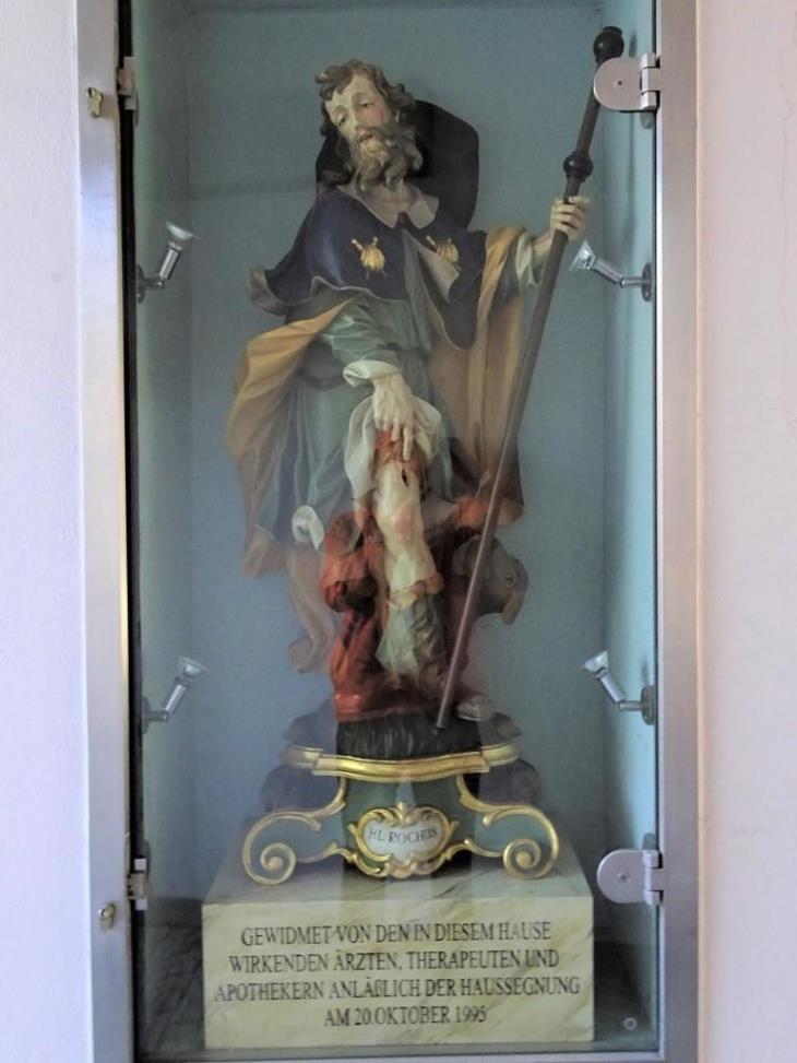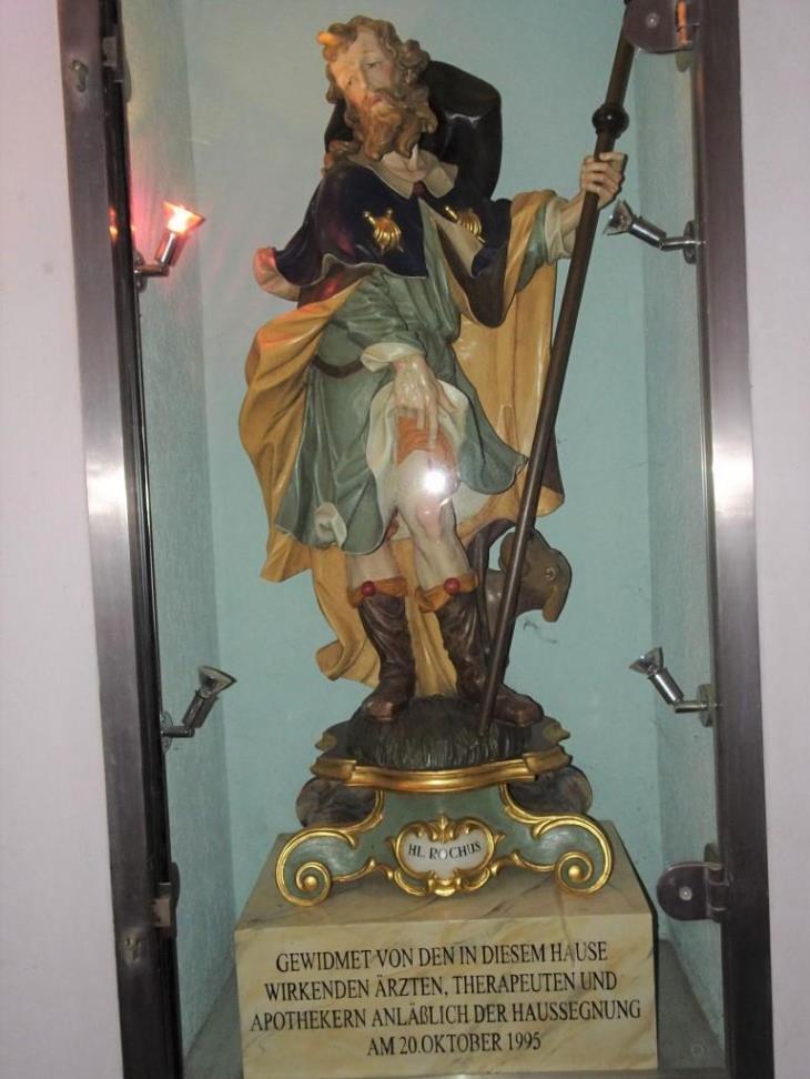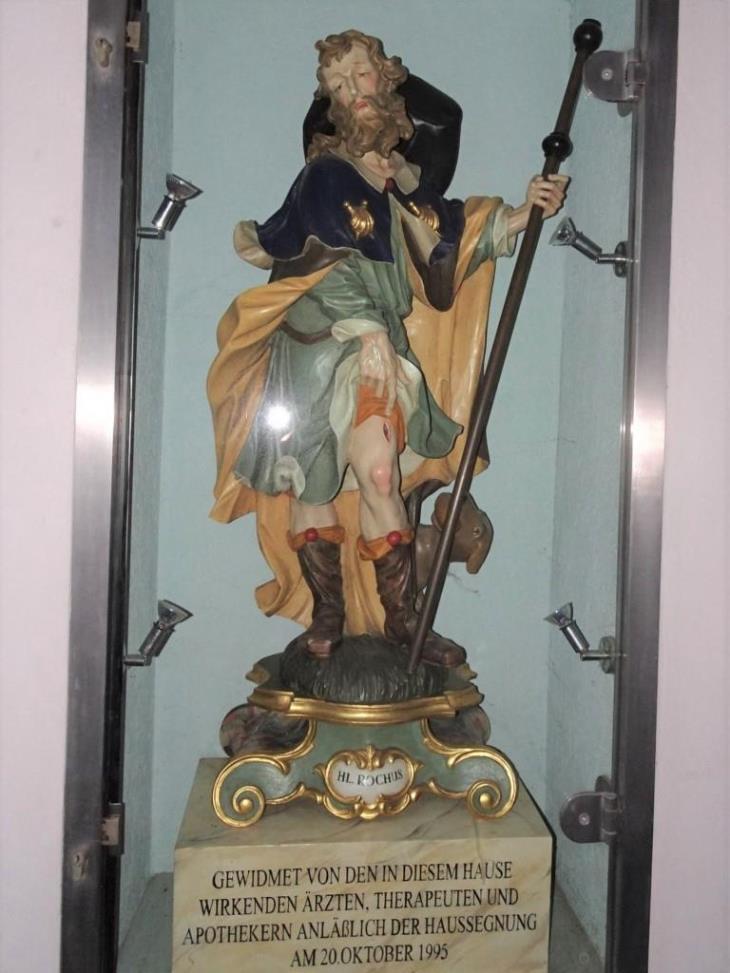 Der Legende nach ist heilige Rochus aus Montpellier (Frankreich) gebürtig. Er lebte dort Anfang des 14. Jahrhunderts, stammte aus einer reichen Familie, doch teilte er sein Vermögen unter den Armen aus und pflegte auf seiner Pilgerreise nach Rom viele Pestkranke aufopferungsvoll. Dabei zeigte sich seine Gabe, Pestkranke allein durch das Zeichen des Kreuzes Christi wundersam zu heilen. Aus diesem Grund ist er Schutzpatron der Kranken, Krankenhäuser, Ärzte, Chirurgen und Apotheker.