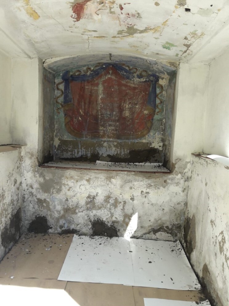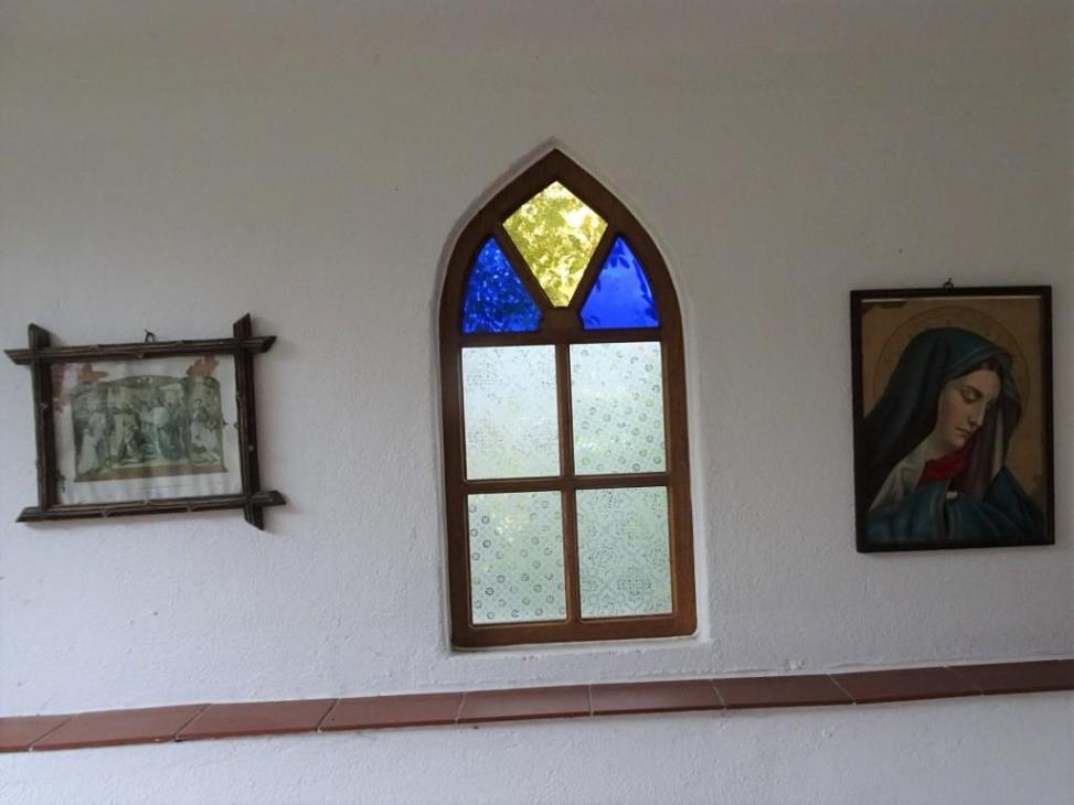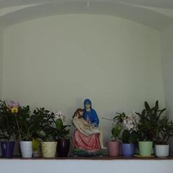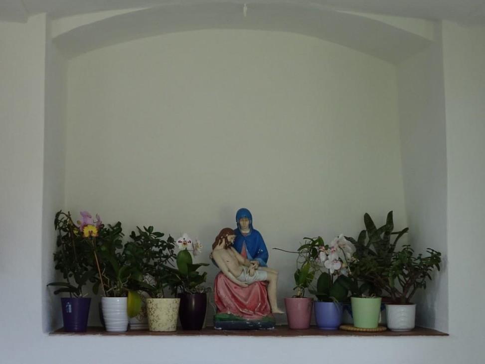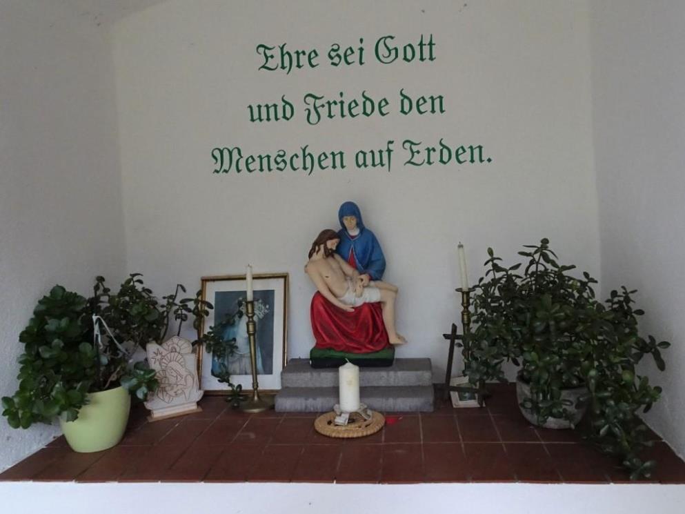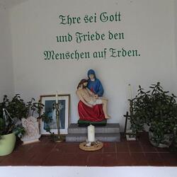 Im Zentrum des schönen Zeichens des Glaubens wurde ein verfliester Altar in das Mauerwerk eingelassen. Im Mittelpunkt steht auf einem Podest eine von Birgit Kahr kunstvoll restaurierte Pietà-Statue, eine Darstellung der heiligen Maria mit dem Leichnam Christi auf dem Schoß. Darüber steht auf der Mauer in grüner Schrift: „Ehre sei Gott und Friede den Menschen auf Erden.“