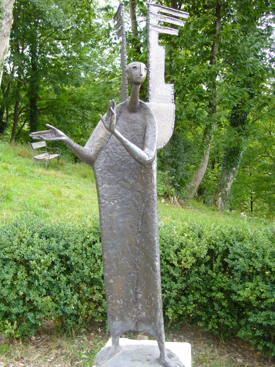 Kurz bevor man den Kirchplatz erreicht verweist ein Bronzeengel, der Erzengel Gabriel, gestaltet von Erwin Huber (2000) auf das Haus unserer Gottesmutter Maria.