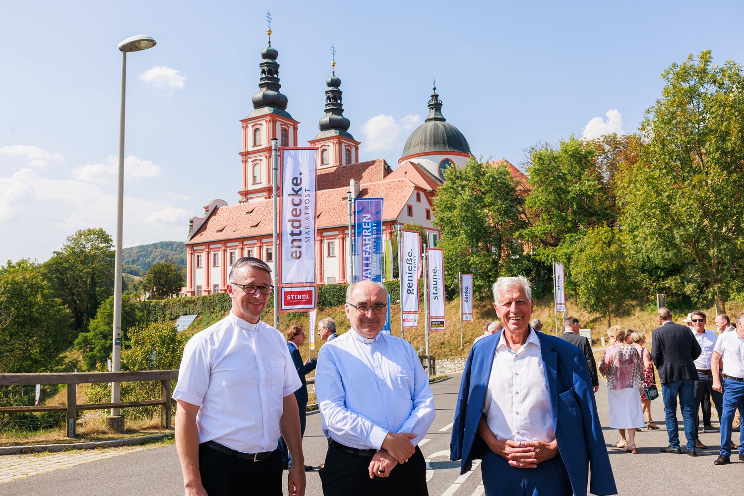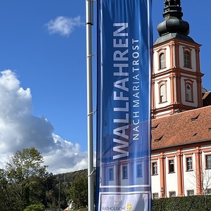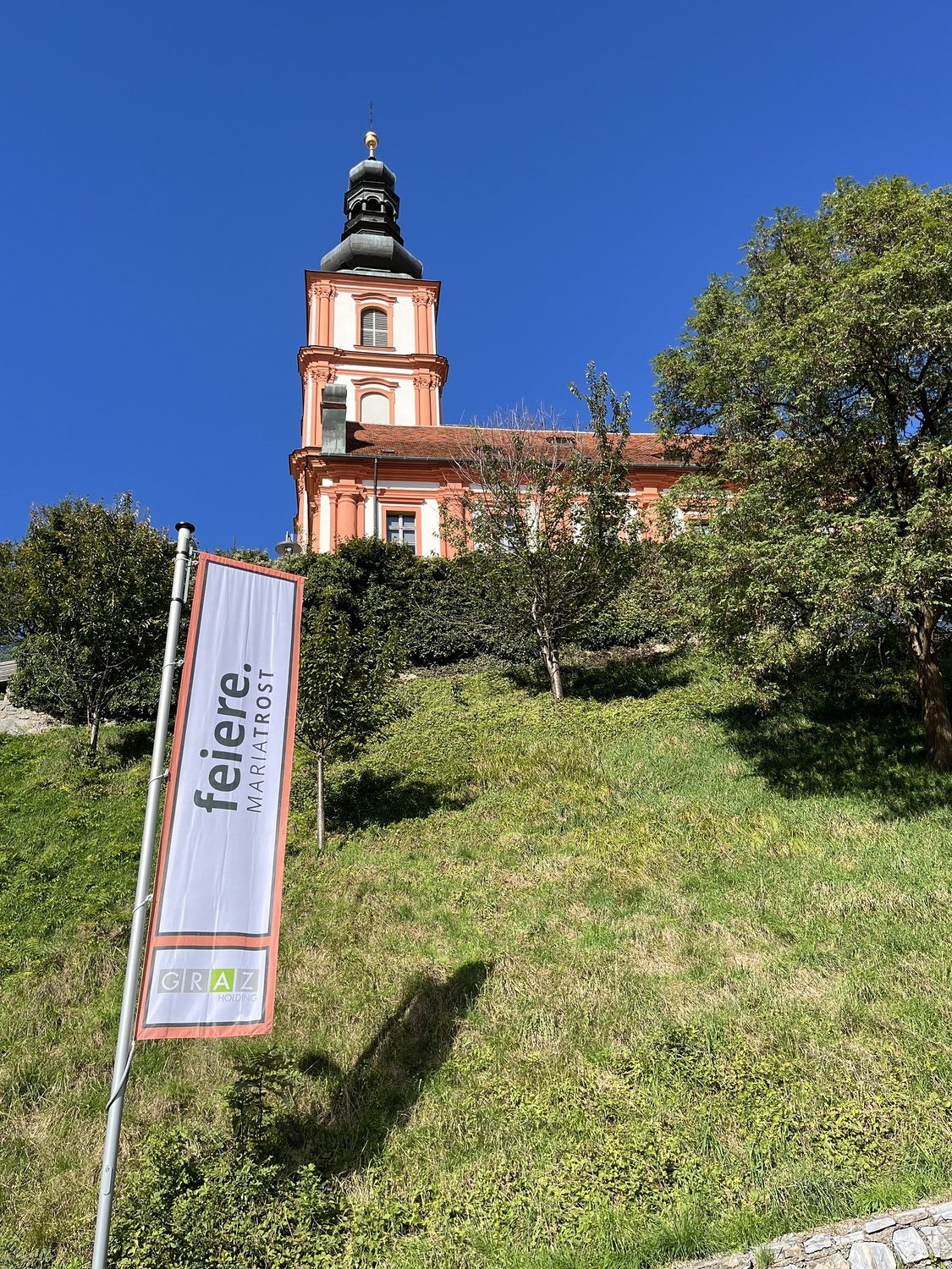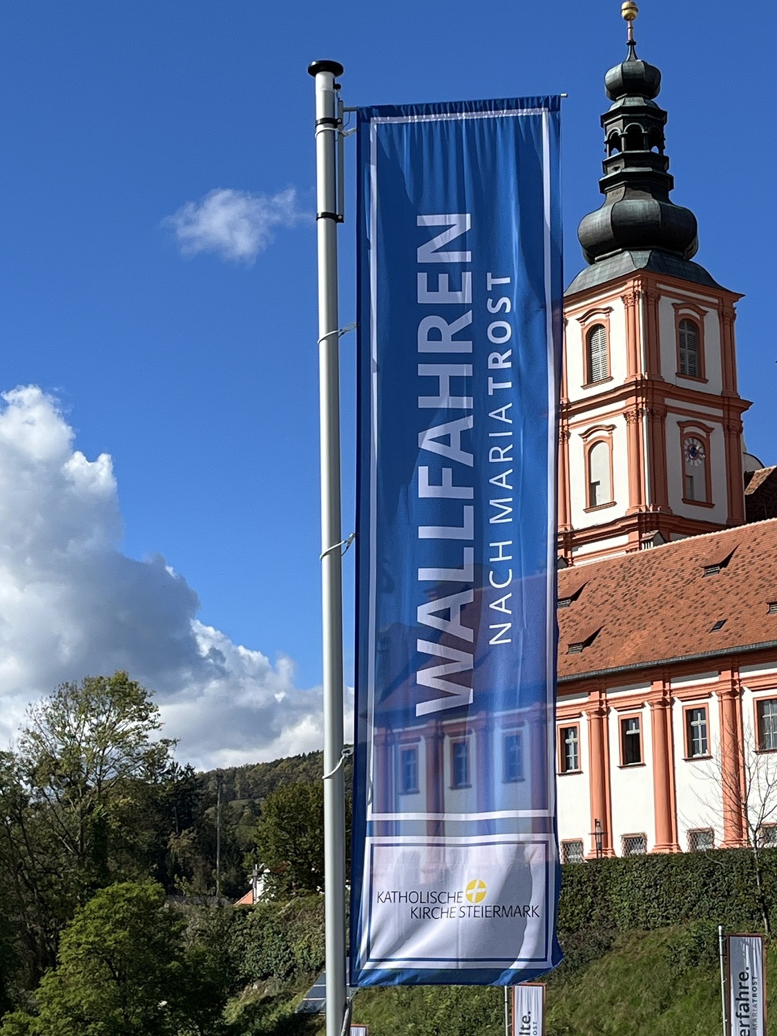 Da flattert etwa: „entdecke MARIATROST“, „gestalte MARIATROST“, genieße MARIATROST“. – Im Rahmen einer Feier mit Sponsoren, Pfarraktiven und Freunden segnete Diözesanbischof Wilhelm Krautwaschl die Fahnen und wünschte viel Gelingen für die weiteren Schritte des für die steirische Kirche wichtigen Projektes.