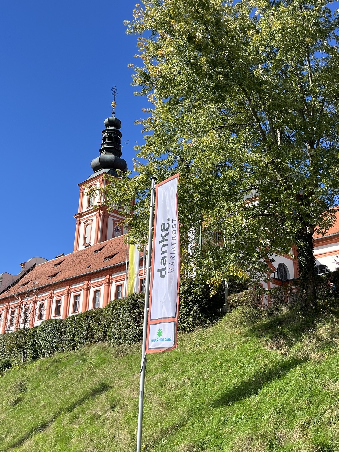 Mit einem Gedankenimpuls laden die Fahnen die Besuchenden zu einem vielfältigen Erleben von MARIATROST ein.