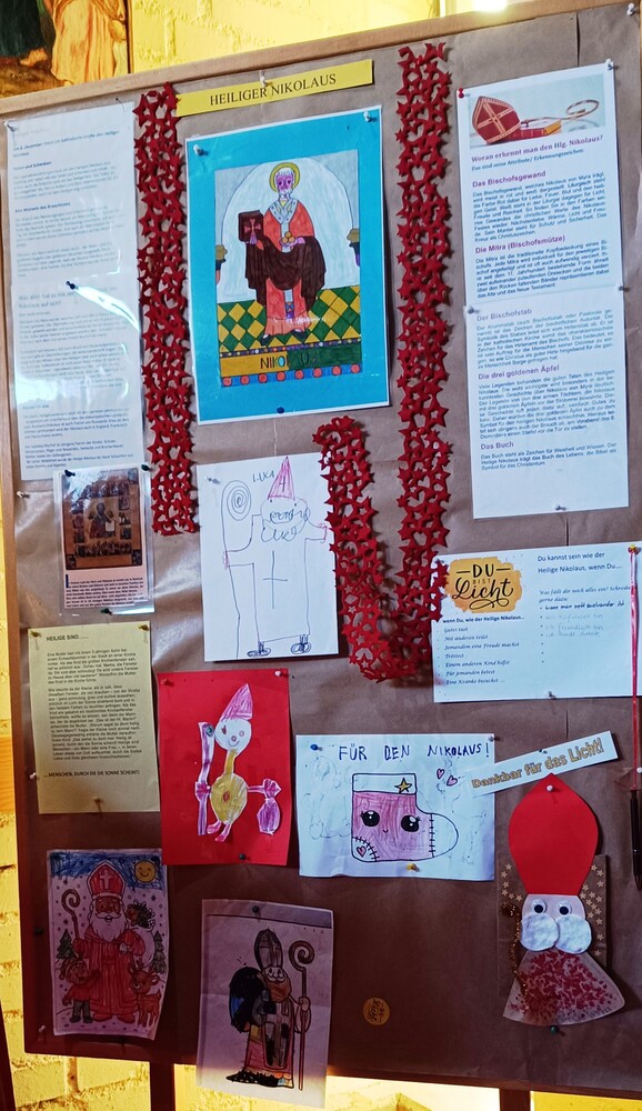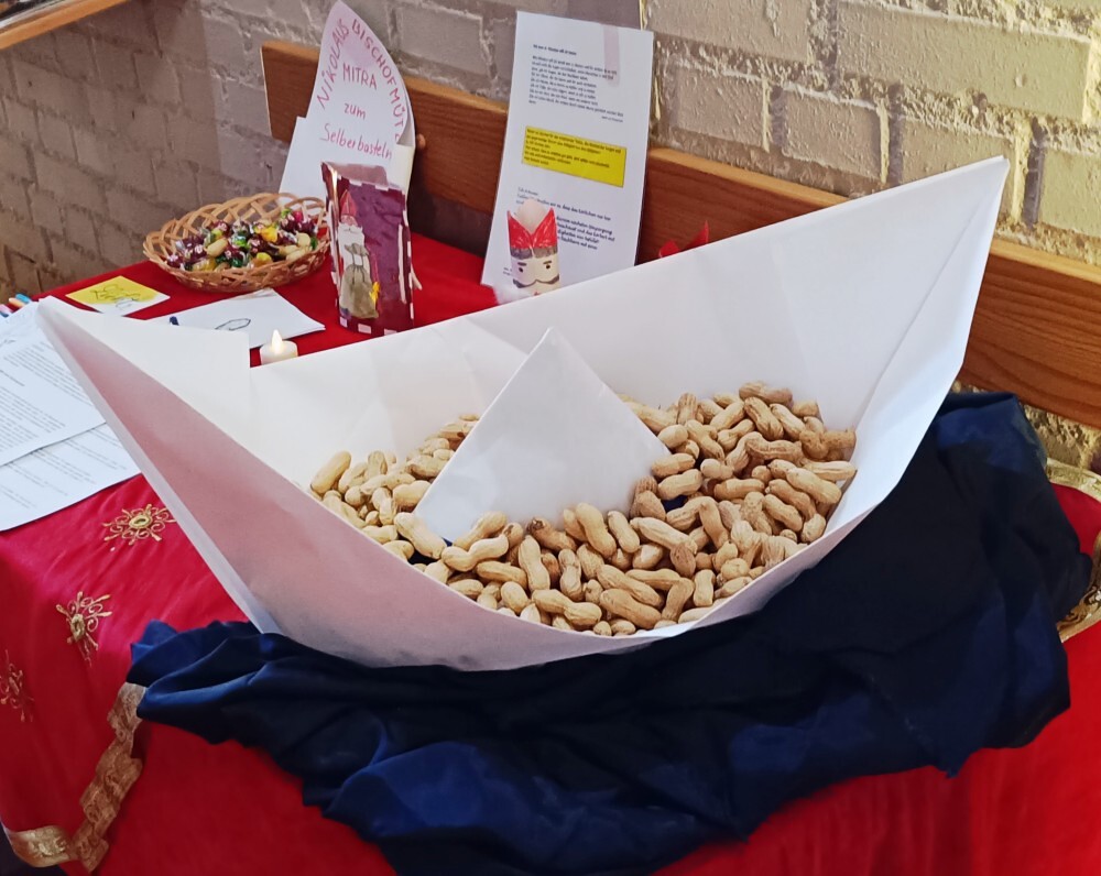 Bei der Nikolausstation in der Kirche gab es auch Feiervorschläge,  Ausmalbilder, Süßes und Nikolausmützen zum selber basteln.