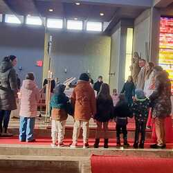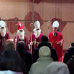 Die Kinder wurden gefragt, woran man den Bischof Nikolaus erkennt und halfen, die im Altarraum verteilten richtigen Erkennungszeichen, die man bei einem Heiligen Attribute nennt, zu finden und Erwin anzuziehen. Dazu gab es schöne Texte und Fürbitten. Als Nikolaus erzählte er dann die Geschichte von den 3 goldenen Kugeln, mit denen der Heilige oft dargestellt wird.