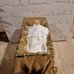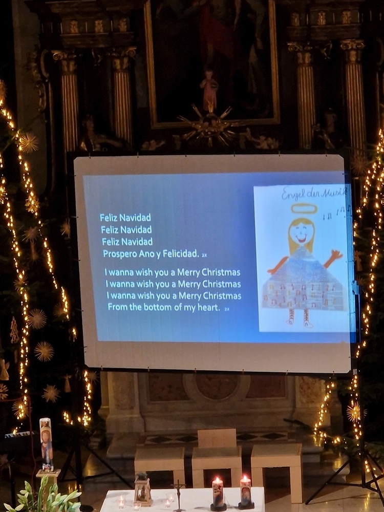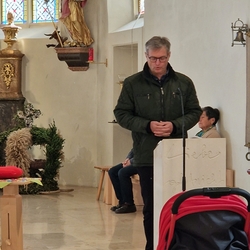 In seiner Predigt sprach Vikar Gerhard von Gott, der als kleines, hilfloses Kind zur Welt gekommen ist, in Armut und Bedürftigkeit. Eine mitgebrachte Windel symbolisiert dies. - Gott ist einer von uns, er kommt uns entgegen. Er ist ein Gott, an den wir uns anlehnen können. Er umarmt uns und stillt unser Verlangen nach Geborgenheit, Liebe und Frieden. …