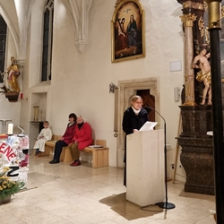 Noch einmal wurden – wie schon am Friedhof – die Namen der Verstorbenen von Allerheiligen 2022 bis Allerheiligen 2023 vorgelesen. 43 Teelichter wurden entzündet, eines davon für alle nicht namentlich genannten Verstorbenen.