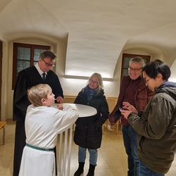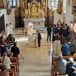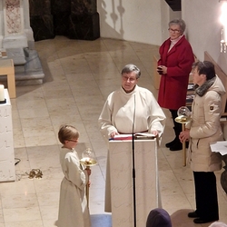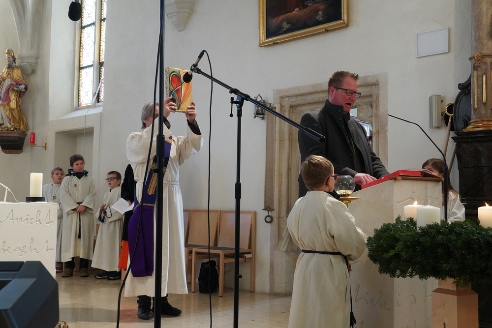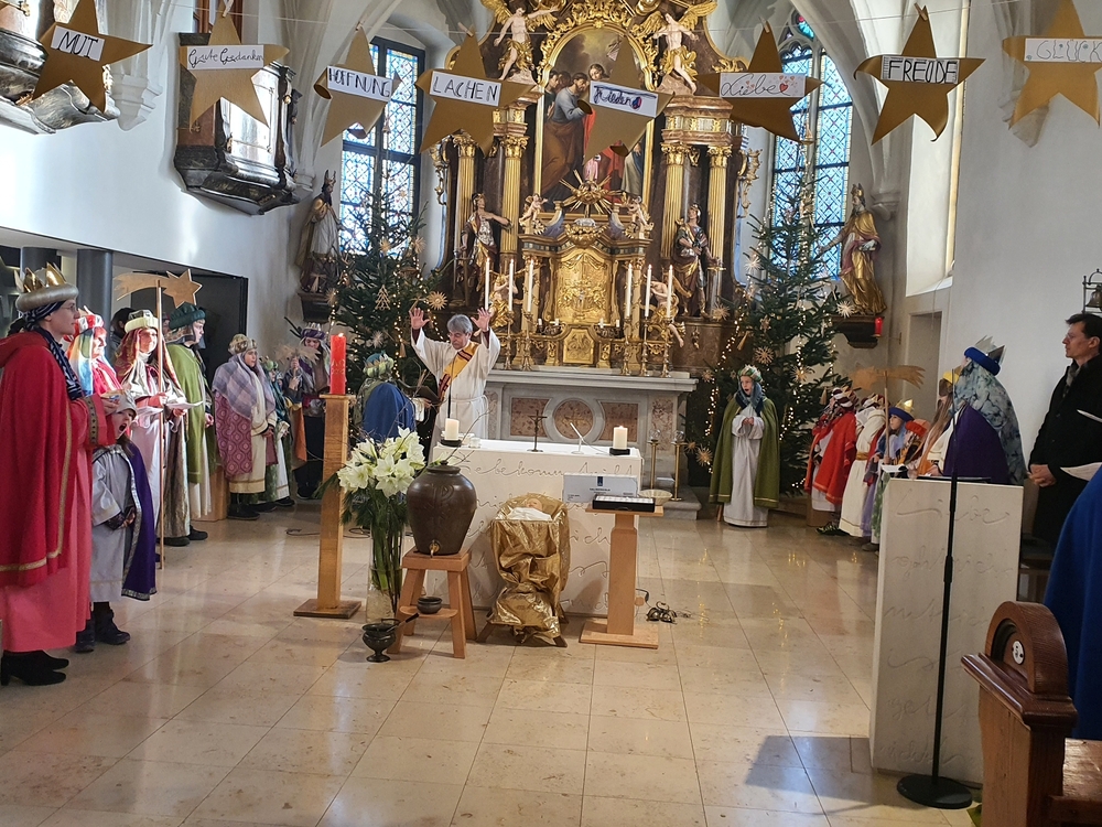 Mit einem königlichen Einzug begann der Sternsingergottesdienst am Dreikönigstag. Diakon Michi Zepf zelebrierte die Wort-Gottes-Feier mit Kommunionspendung zum „Hochfest der Erscheinung des Herrn“. In vielen Texten und Liedern kam das Anliegen der Dreikönigsaktion zum Ausdruck. Noch einmal trat eine Sternsingergruppe auf und präsentierte ihre Botschaft. Die Segnung des Dreikönigswassers und des Salzes, das auch zum Mitnehmen angeboten wurde, bildete zusammen mit der Allerheiligenlitanei, vorgetragen von Martin Kirchberger, den feierlichen Abschluss der WGF.