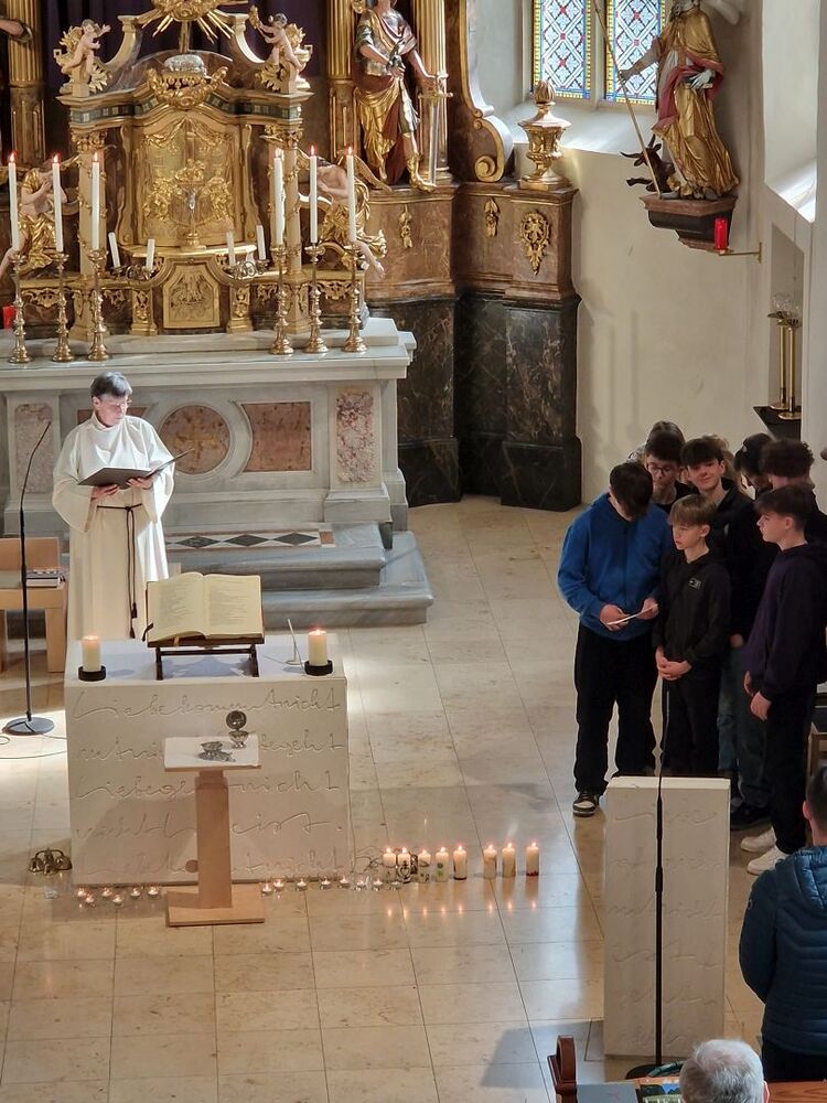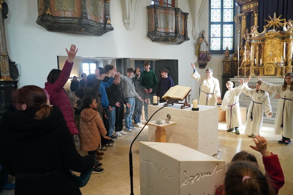 Im Anschluss an die Workshops feierte Vikar Mag. Hatzmann mit uns die Heilige Messe. Nach dem Hören der Heiligen Schrift besprachen wir die Symbole Brot und Hand.