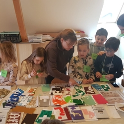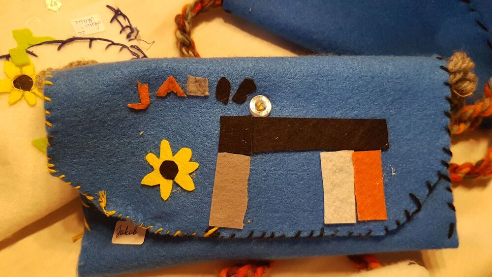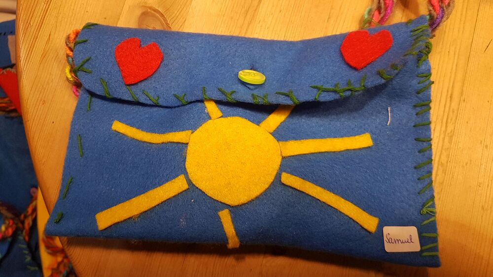 Dieser Arbeitsvorgang hat wirklich einiges von unseren Kindern abverlangt. Sie mussten sich für eine Farbe bei Stoff und Faden entscheiden, dann schneiden, den Stoff mit Schlingstichen zu einer Tasche zusammennähen, sich einen Knopf aussuchen und diesen auch alleine annähen und schlussendlich sehr mutig sein, da sie für den Knopf noch ein Loch in ihre Tasche schneiden mussten. Dann fast am Ende überlegten sich die Kinder auch noch ein Motiv, das sie auf ihre Taschen klebten und drehten ihre Schnüre, damit sie ihre Taschen auch umhängen konnten. Jede Tasche ist einmalig und wunderschön geworden.