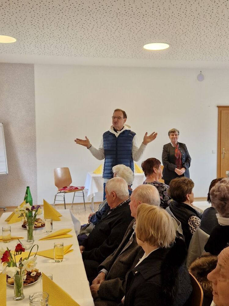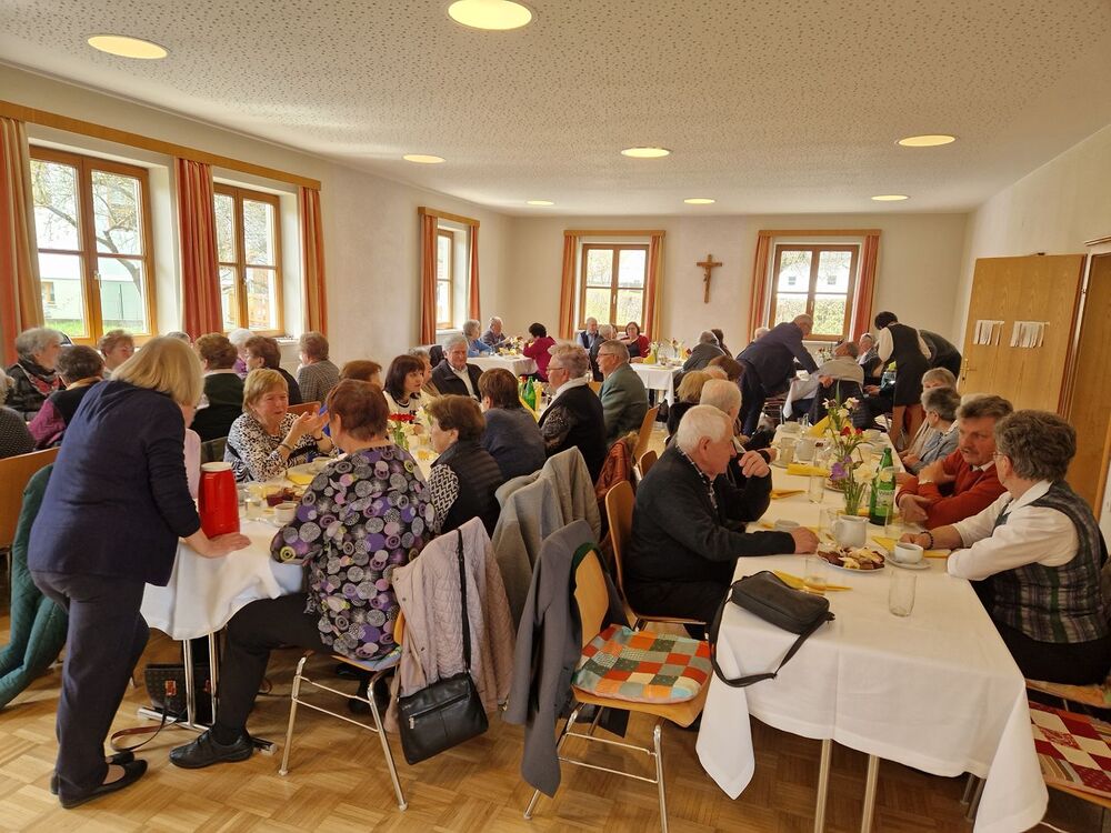 Nach der geistig-seelischen Stärkung in der Kirche genossen die75+ Gäste die leibliche Stärkung im Pfarrheim, für die der Sozialkreis, geleitet von Elisabeth Schöpf, wieder bestens sorgte. Ein kleiner Witz von Vikar Hatzmann und die musikalische Untermalung von Jakob Mayer am Keyboard sorgten sogleich für Auflockerung und gute Stimmung.
