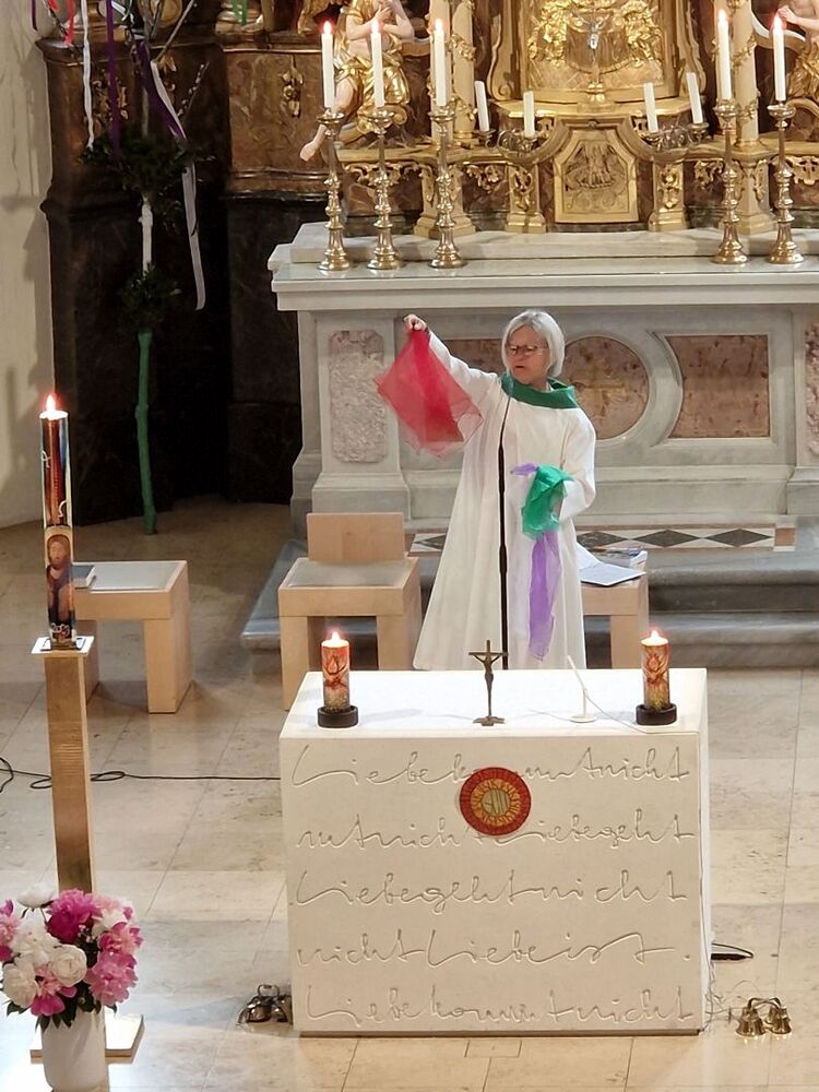 Sehr anschaulich erläuterte Helga mit einem Symbol das Wesen des dreieinen Gottes und brachte in der Predigt ihre Gedanken zur „Dreifaltigkeit“ zum Ausdruck: