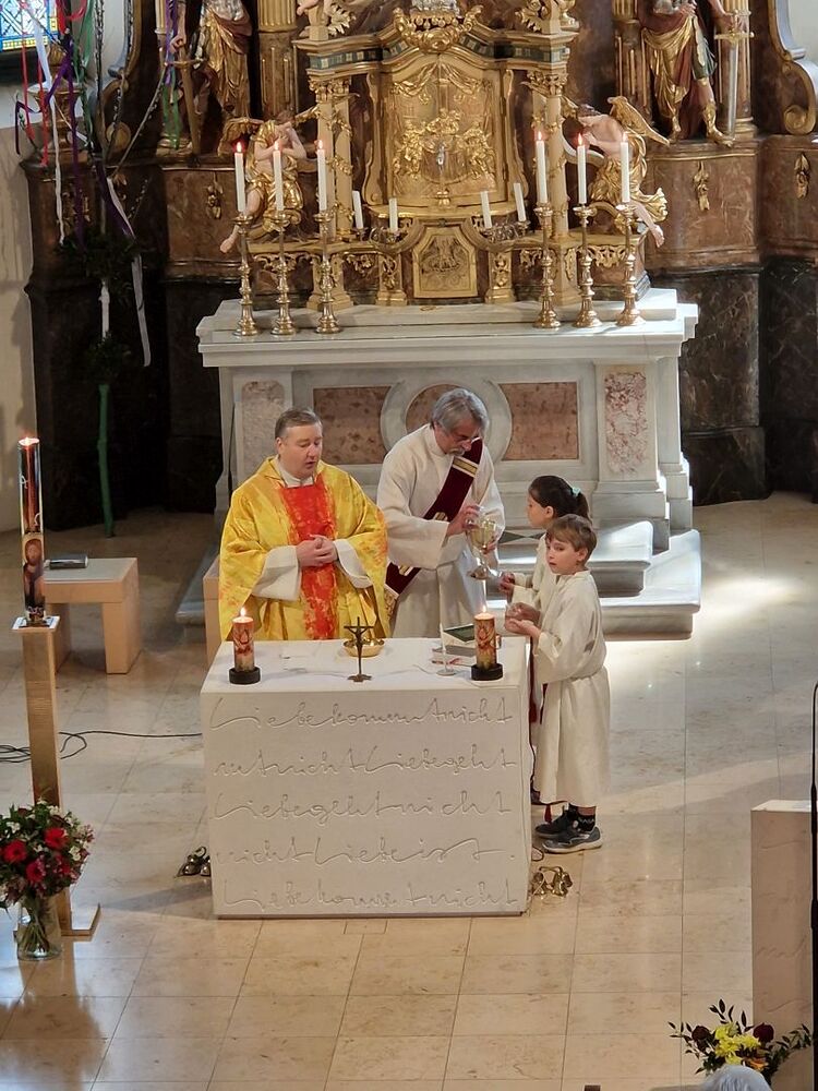 Die Schwestern Lea und Laura vom Erstkommunionkind Lukas Steinberger ließen sich mit drei und fünf Jahren taufen. Das war ein großes Geschenk für die Kinder, denn so konnten sie die Symbole der Taufe hautnah miterleben.