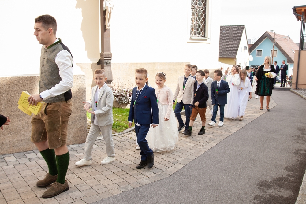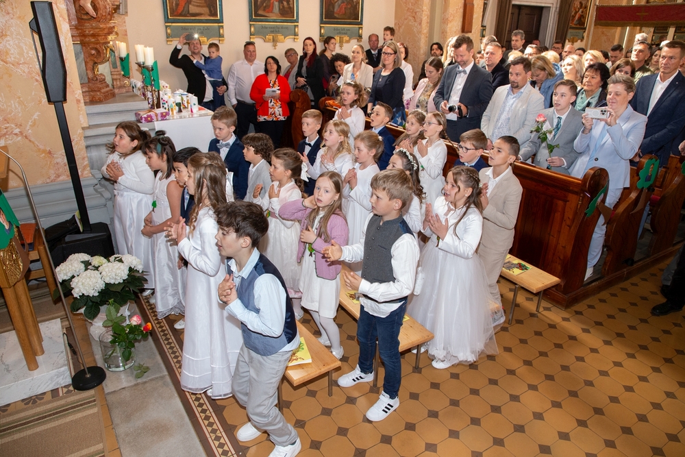 Die Kinder der vier 2. Klassen feierten am Samstag, 4. Mai ihre heilige Erstkommunion aufgrund der schlechten Wetterprognosen in der Pfarrkirche Wundschuh. Erstmals konnten wir mit 52 Kindern und ihren Familien nicht auf unserem Kirchplatz in Premstätten feiern. Bei 13 Grad Celsius zogen die Kinder in die Kirche ein. Doch uns wurde bald wärmer! Nicht nur durch das schöne miteinander Feiern, sondern auch weil so viele Gäste die Kirche bis auf den letzten Platz füllten.