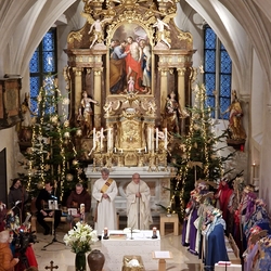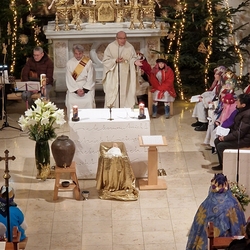 Nach altem Ritus segnete Diakon Michi Zepf nach dem Schlusssegen noch das „Dreikönigswasser“ und das Salz, welches in kleinen Fläschchen mitgenommen werden durfte. Die Allerheiligen-Litanei wurde von Johannes Chum vorgetragen.