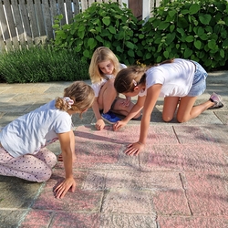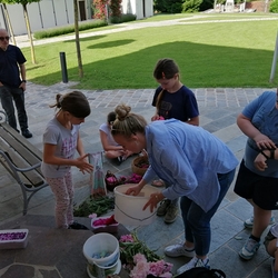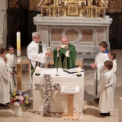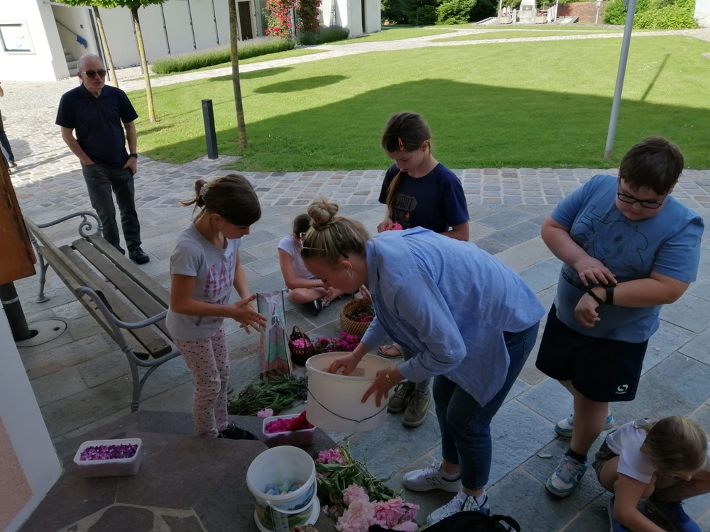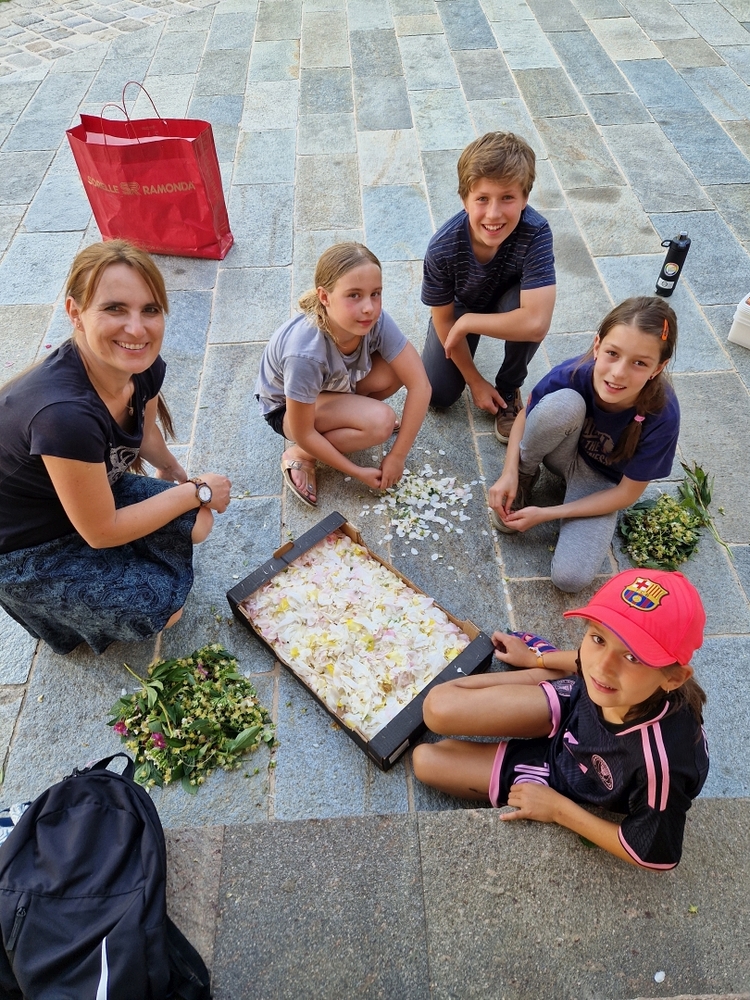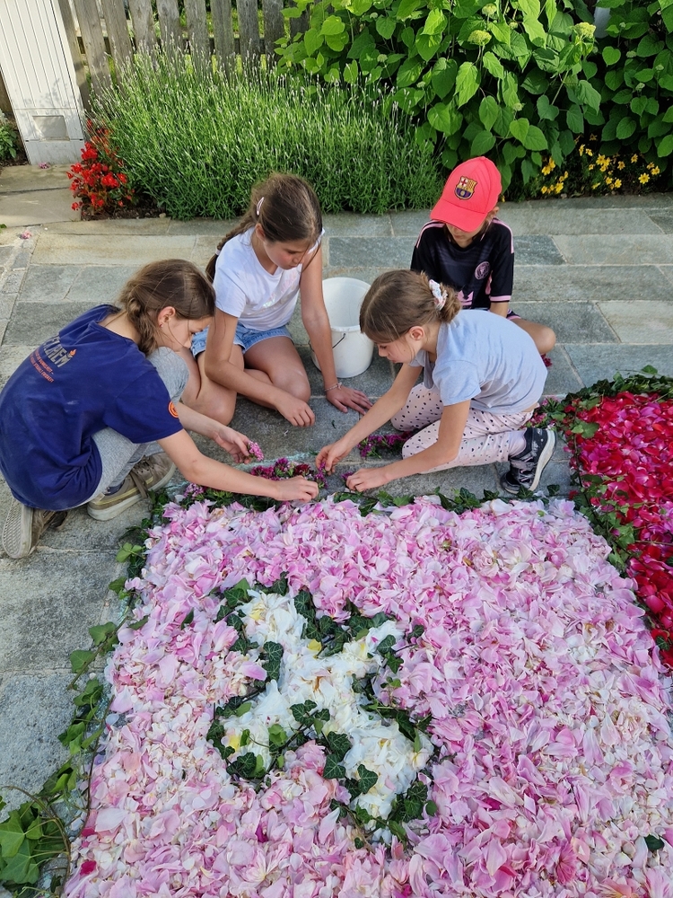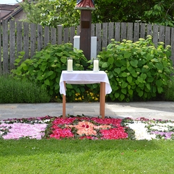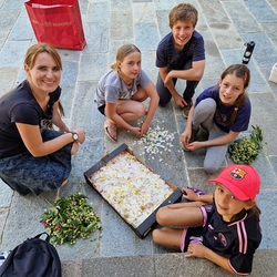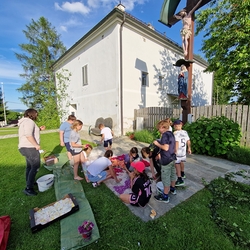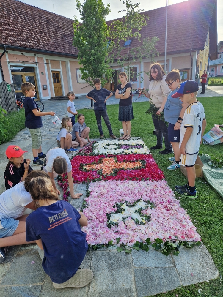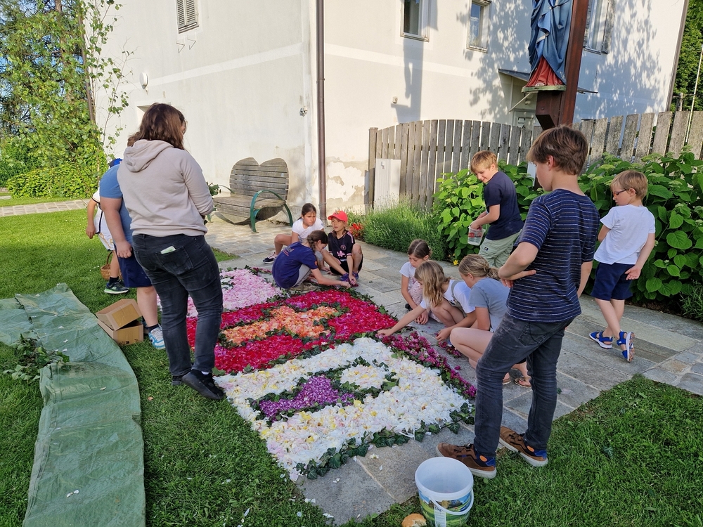 Mit großer Freude und Kreativität legten auch heuer die Minis am Vorabend zu Fronleichnam ein Blumenbild, diesmal sogar ein Tryptichon: Kelch und Brot, ein Kreuz und eine Taube wurden mit viel Eifer zuerst aufgemalt und dann mit den Blüten gestaltet.