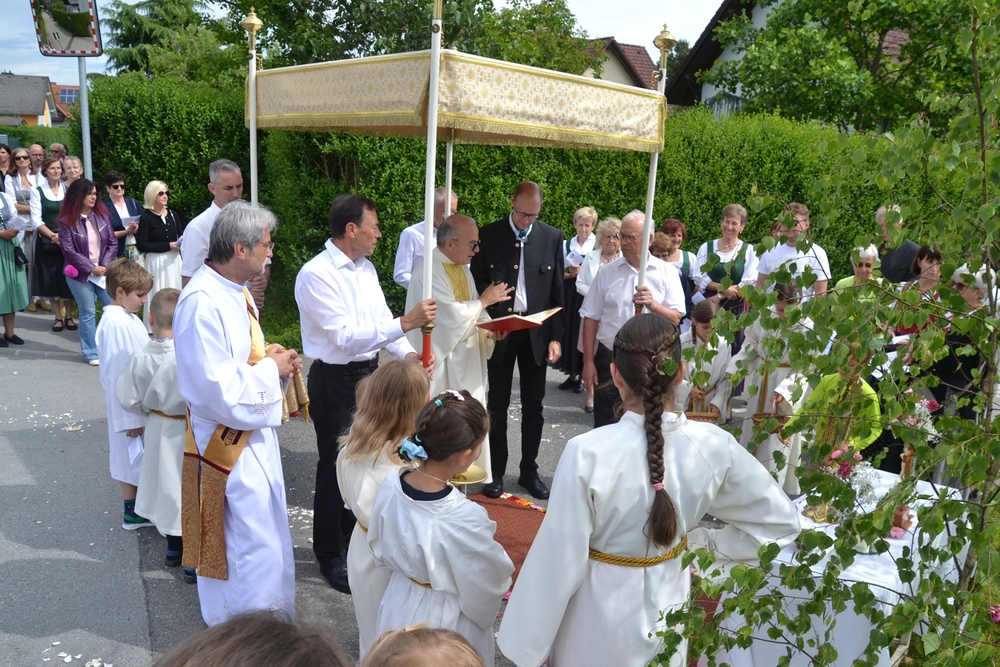 So konnte nach der heiligen Messe mit Vikar Norbert Glaser und Diakon Michi Zepf die Prozession wie geplant ihren Weg nehmen. An den vier Altären, die liebevoll geschmückt waren, wurde das Wort Gottes verkündet und Lobpreis, Dank und Bitte in Gebeten und Liedern ausgedrückt.