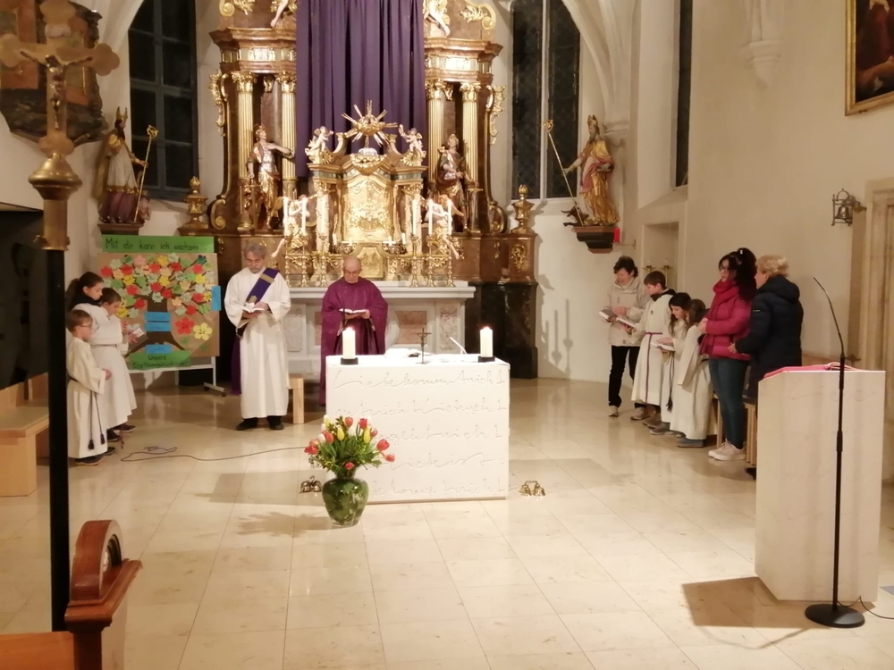 So feierten Groß und Klein mit Vikar Gerhard Hatzmann und Diakon Michi Zepf die heilige Messe zum Palmsonntag in einem schönen Miteinander. Die Kindergartenkinder sowie einige MS-Schülerinnen gestalteten die Feier mit und die MINIS versahen nicht nur ihren Dienst am Altar, sondern trugen auch die „Passion“ vor - in einer einfacheren Fassung, mit passenden Liedstrophen und Symbolen. Auch die Landjugend nahm teil und kam nach guter Tradition mit ihrem großen Palmbuschen.