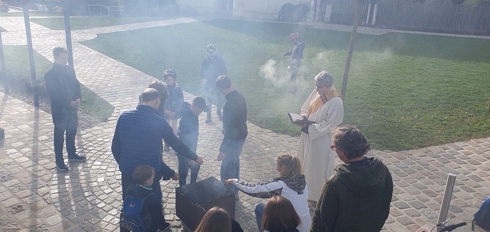 Nach altem Brauch segnete Diakon Michi Zepf am Karsamstag schon frühmorgens das Feuer vor der Kirche, das einige Kinder dann als „Weihfeuer“ in die Häuser und Wohnungen brachten. Es soll die Bewohner*innen vor Unwetter schützen.