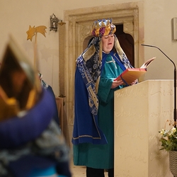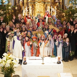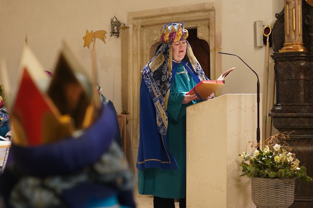 Eine Sternsingergruppe überbrachte die Botschaft, die schon Tage zuvor in den Häusern verkündet worden war: Gott braucht uns, braucht dich und mich, um der Gerechtigkeit auf Erden eine Chance zu geben. Er braucht unsere Solidarität mit den Ärmsten!