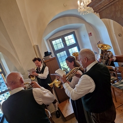 Im Anschluss waren die ehrenamtlichen Mitarbeiterinnen und Mitarbeiter beider Pfarren zum gemütlichen Beisammensein ins Kulturheim Wundschuh geladen. Dort konnte man - bei fröhlicher Musik der Lichtmessgeiger - köstliche Brötchen, Sekt und Krapfen genießen und den Rosenmontag mit angeregten Gesprächen ausklingen lassen.