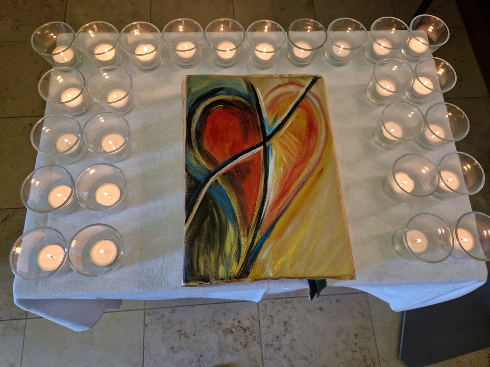 Die Lichter vor dem bunten Kreuz künden von der Wort-Gottes-Feier, die Elisabeth Schöpf am 9. Juni, dem Vatertag, in unserer Kirche gestaltete.