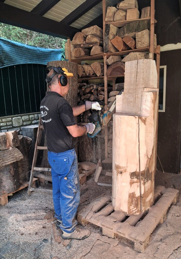 JOSEF - Der erste Anschnitt mit Rindenentfernung beim Eschenholzstamm.