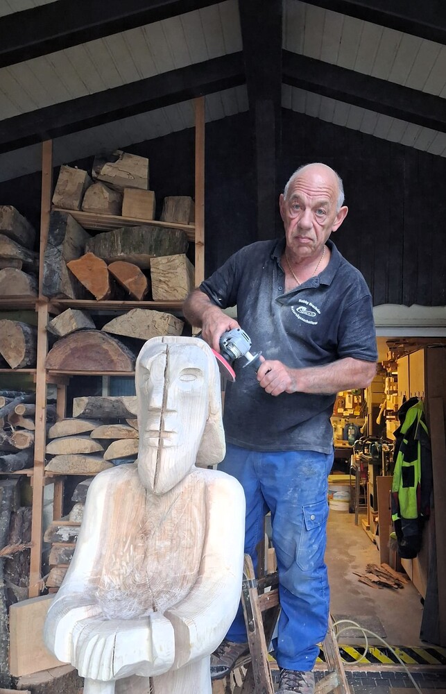 Der Motorsägenschnitzer und Hobby Drechsler Johann Tscherner und seine fertigen "Werke".