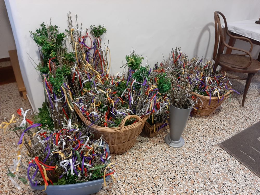 Vor dem Gottesdienst wurden wieder Palmbuschen vom Pfarrgemeinderat, gegen eine kleine Spende angeboten. Die Palmweihe