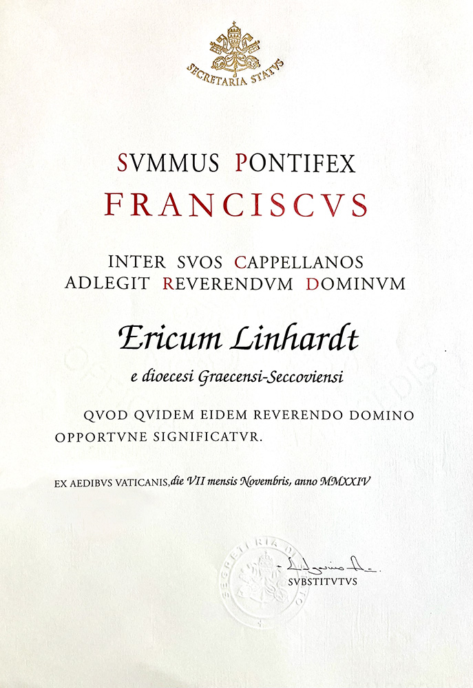 Der in der Pfarre Tobelbad geborene Priester Erich Linhardt wurde von Papst Franzsikus zum päpstlichen Ehrenkaplan („Monsignore“) ernannt.